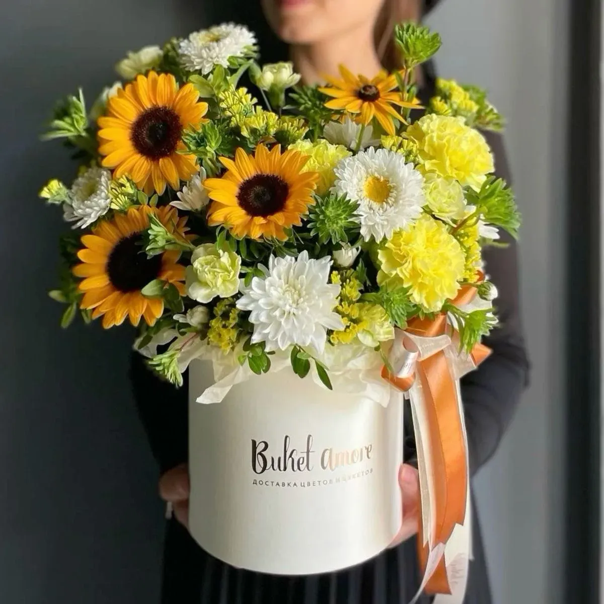 Caja amor primaveral es un arreglo grande de un solo frente elaborado en su gran parte con girasoles como flores principales acompañados de flores en tonalidades amarillas y blancas de alta calidad y follaje finos para crear una composición única , bajo una técnica de espuma floral.