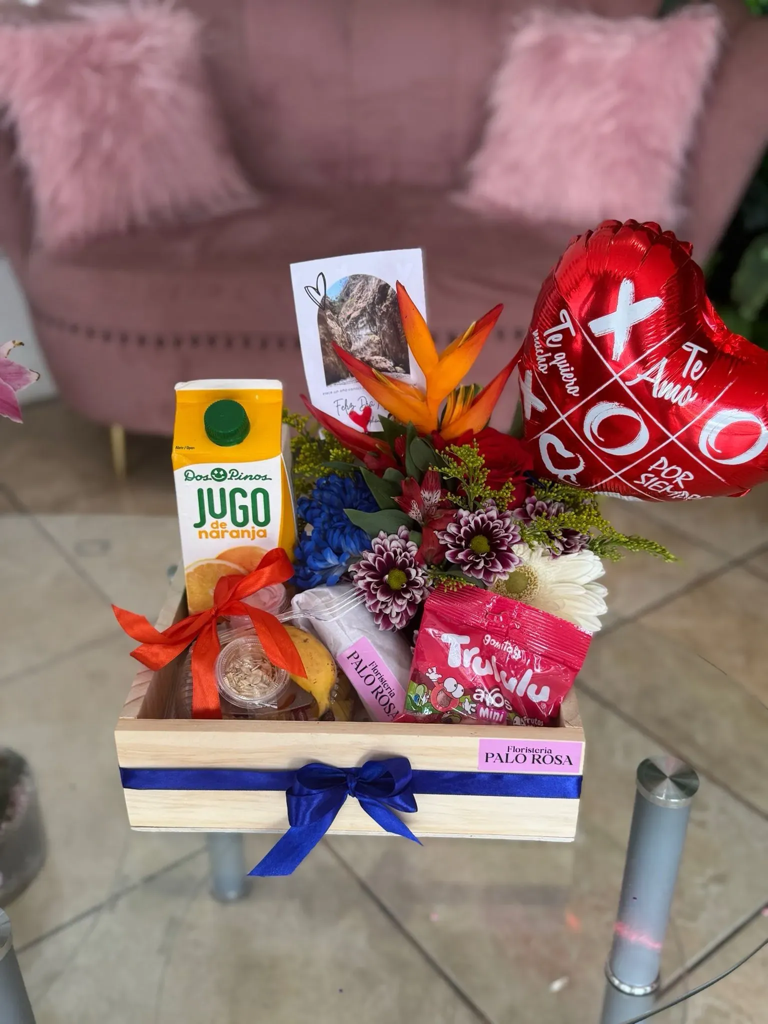 La caja de desayuno sopresa incluye una caja de madera, arreglo floral a la disponibilidad del cliente y la tienda, una ensalada de frutas con su respectivo toopings, un jugo de frutas , una respondería salada o dulce y globo de feliz cumpleaños , te amo o feliz día.